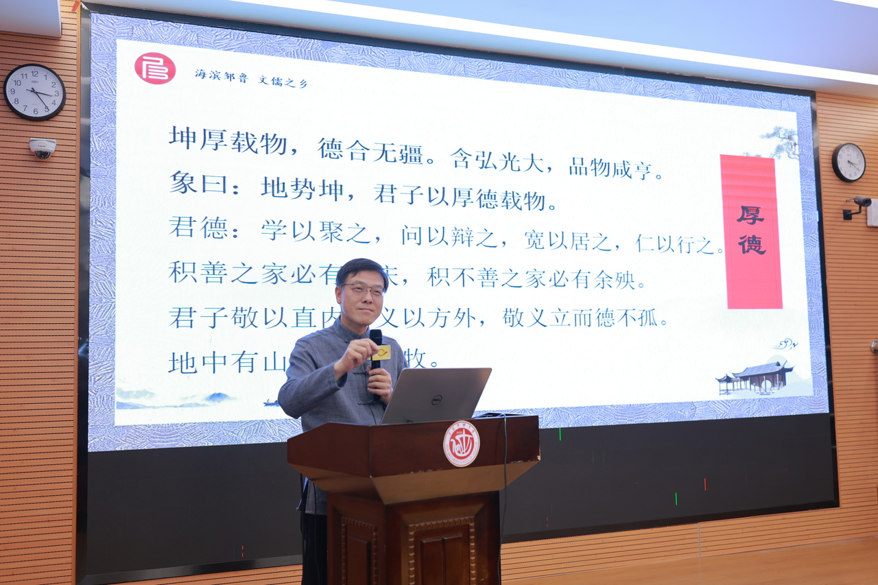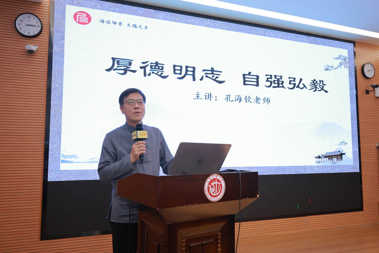 主講人(rén)文(wén)儒學院院長孔海(hǎi)欽老師(shī)進行(xíng)了“厚德、明(míng)志、自強、弘毅”的(de)主題講座。