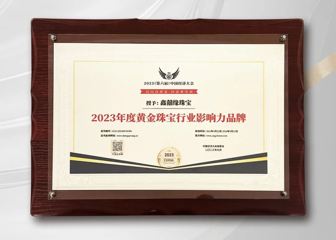 榮譽時刻|鑫囍緣榮獲2023年度黃(huáng)金(jīn)珠寶行(xíng)業(yè)影響力品牌